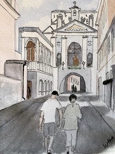 2021De mooie poort van Vilnius, hoofdstad van Litouwen, gemaakt in aquarel en met Oost-Indische inkt
